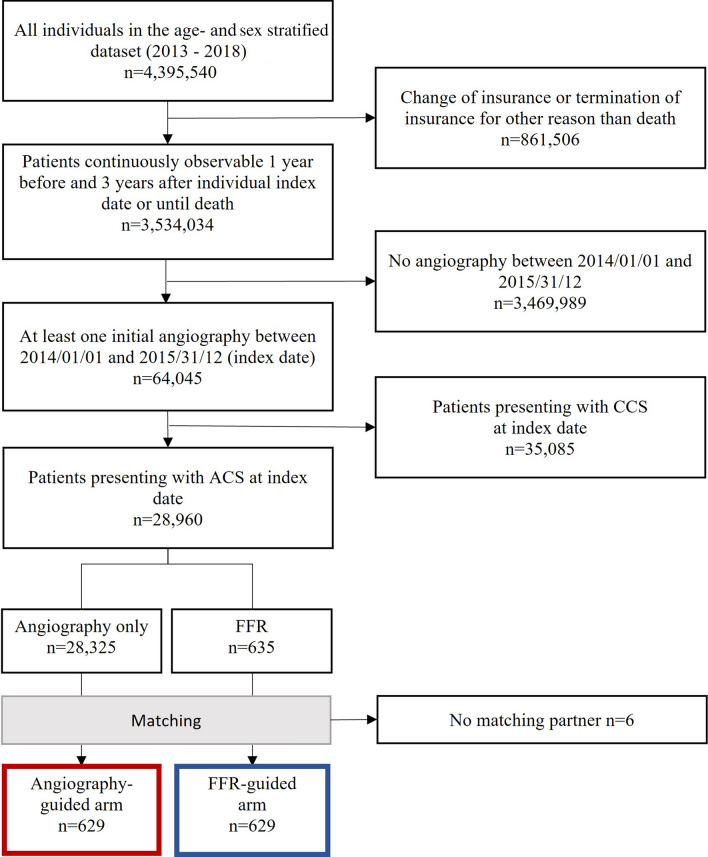 Randomized trials suggest benefits for fractional flow reserve (FFR)-guided vs. angiography-guided treatment strategies in well-defined and selected patient cohorts with acute coronary syndromes (ACS). The long-term prognostic value of FFR measurement in unselected all-comer ACS patients, however, remains unknown. This subanalysis of the Fractional FLOw Reserve In cardiovascular DiseAses (FLORIDA) study sought to investigate the long-term effects of FFR in the management of lesions in patients with acute coronary syndrome (ACS). FLORIDA was an observational all-comer cohort study performed in Germany, that was population-based and unselected. Patients enrolled into the anonymized InGef Research Database presenting with ACS and undergoing coronary angiography between January 2014 and December 2015 were included in the analysis. Patients were stratified into either the FFR-guided or the angiography-guided treatment arm, based on the treatment received. A matched cohort study design was used. The primary endpoint was all-cause mortality. The secondary endpoint was major adverse cardiovascular events (MACE), a composite of death, non-fatal myocardial infarction (MI), and repeat revascularization. Follow-up time was 3 years. Rates of 3-year mortality were 10.2 and 14.0% in the FFR-guided and the angiography-guided treatment arms (p = 0.04), corresponding to a 27% relative risk reduction for FFR in ACS patients. Rates of MACE were similar in both arms (47.7 vs. 51.5%, p = 0.14), including similar rates of non-fatal MI (27.7 vs. 25.4%, p = 0.47) and revascularization (9.9 vs. 12.1%, p = 0.17). In this large, all-comer observational study of ACS patients, FFR-guided revascularization was associated with a lower mortality at 3 years. This finding encourages the routine use of FFR to guide lesion revascularization in patients presenting with ACS.