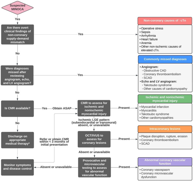- •• Tamis-Holland JE, Jneid H, Reynolds HR, et al. Contemporary diagnosis and management of patients with myocardial infarction in the absence of obstructive coronary artery disease: a scientific statement from the American Heart Association. Circulation. 2019;139(18):E891-E908. 10.1161/CIR.0000000000000670/FORMAT/EPUB. This study is important because it was the first scientific statement from AHA that described the diagnostic approach to patients presenting with MINOCA. - PubMed