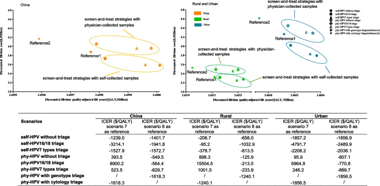 Results: Compared with current strategies in China (physician-HPV with genotype or cytology triage), all screen-and-treat strategies are cost-effective and self-HPV without triage is optimal with the most incremental quality-adjusted life-years (QALYs) gained (220 to 440) in rural and urban China. Each screen-and-treat strategy based on self-collected samples is cost-saving compared with current strategies (-$818,430 to -$3540) whereas more costs are incurred using physician-collected samples compared with current physician-HPV with genotype triage (+$20,840 to +$182,840). For screen-and-treat strategies without triage, more costs (+$9404 to +$380,217) would be invested in the screening and treatment of precancerous lesions rather than the cancer treatment compared with the current screening strategies. Notably, however, more than 81.6% of HPV-positive women would be overtreated. If triaged with HPV 7 types or HPV16/18 genotypes, 79.1% or 67.2% (respectively) of HPV-positive women would be overtreated with fewer cancer cases avoided (19 cases or 69 cases).