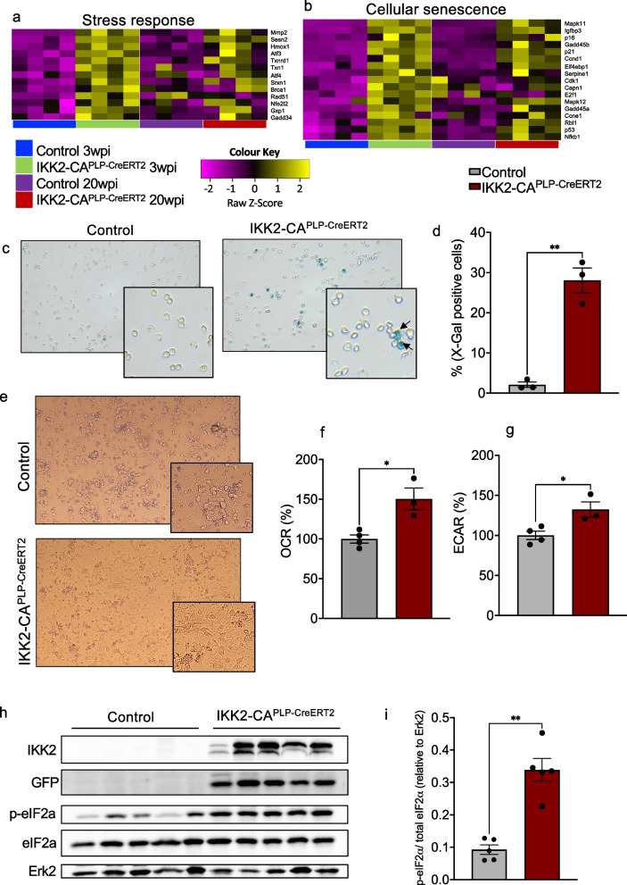 Results: Chronic NF-κB activation in mature OLs leads to aggravated neuroinflammatory conditions phenocopying brain inflammaging. As a consequence, IKK2-CAPLP-CreERT2 mice showed specific neurological deficits and impaired motoric learning. Upon aging, persistent NF-κB signaling promotes WMD in these mice as ultrastructural analysis revealed myelination deficits in the corpus callosum accompanied by impaired myelin protein expression. RNA-Seq analysis of primary oligodendrocytes and microglia cells uncovers gene expression signatures associated with activated stress responses and increased post mitotic cellular senescence (PoMiCS) which was confirmed by elevated senescence-associated β-galactosidase activity and SASP gene expression profile. We identified an elevated integrated stress response (ISR) characterized by phosphorylation of eIF2α as a relevant molecular mechanism which is able to affect translation of myelin proteins.