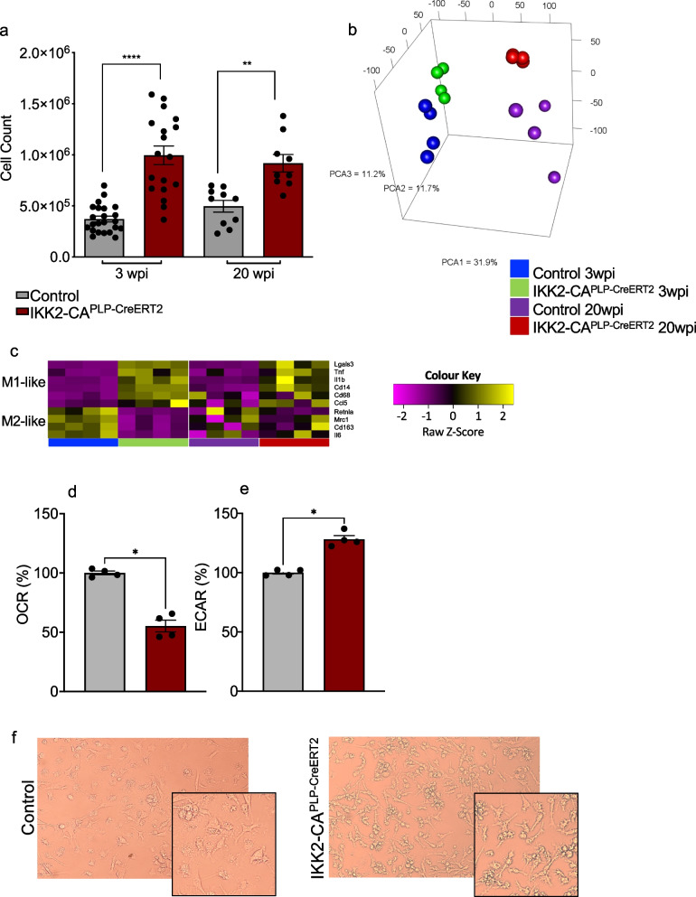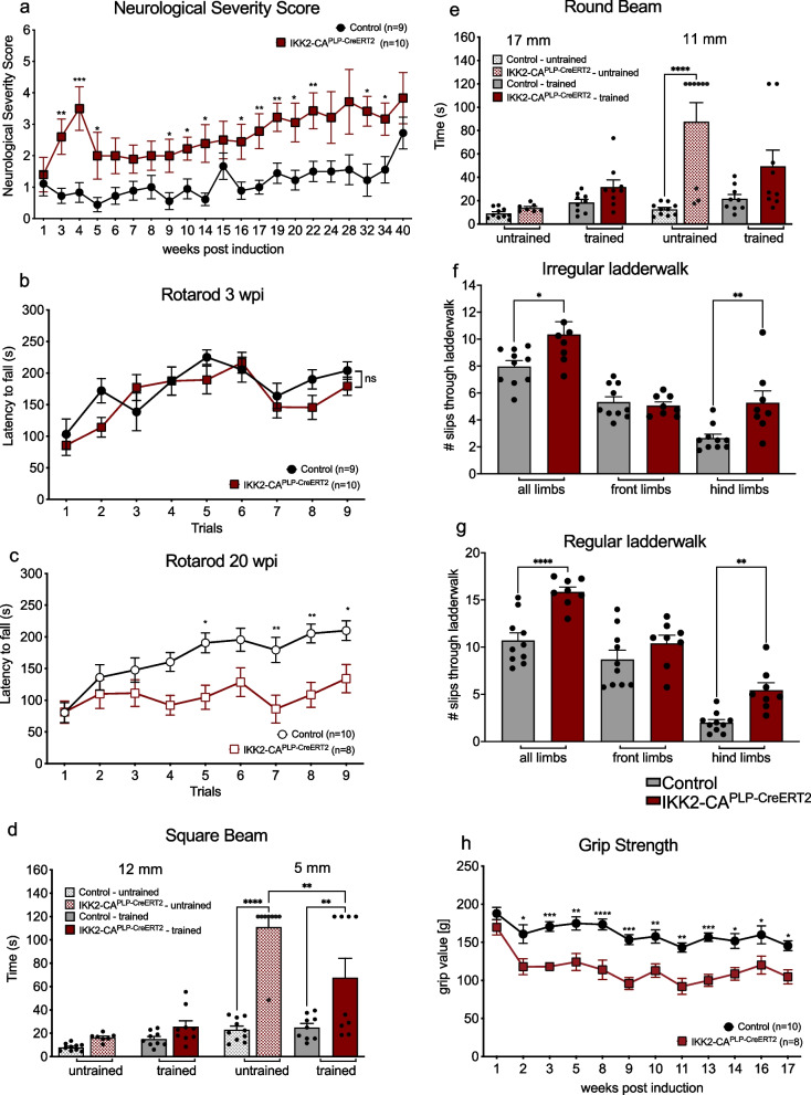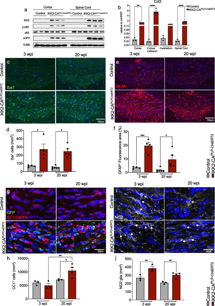 Methods: To functionally analyze the role of IKK/NF-κB signaling in the regulation of myelin homeostasis and maintenance in the adult CNS, we established a conditional mouse model allowing NF-κB activation in mature myelinating oligodendrocytes. IKK2-CAPLP-CreERT2 mice were characterized by biochemical, immunohistochemical, ultrastructural and behavioral analyses. Transcriptome data from isolated, primary OLs and microglia cells were explored by in silico pathway analysis and validated by complementary molecular approaches.