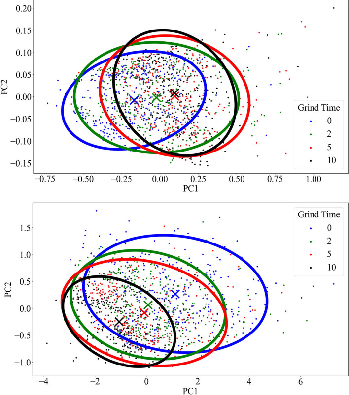 Fourier transform mid infrared (FT-MIR) spectroscopy combined with modeling techniques has been studied as a useful tool for multivariate chemical analysis in agricultural research. A drawback of this method is the sample preparation requirement, in which samples must be dried and fine ground for accurate model calibrations. For research involving large sample sets, this may dramatically increase the time and cost of analysis. This study investigates the effect of fine grinding on model performance using leaf tissue from a variety of crop species. Dried leaf samples (N = 300) from various environmental conditions were obtained with data on 11 nutrients measured using chemical methods. The samples were scanned with attenuated total reflectance (ATR) and diffuse reflectance (DRIFT) FT-MIR techniques. Scanning was repeated after fine grinding for 2, 5, and 10 min. The spectra were analyzed for the 11 nutrients using partial least squares regression with a 75%/25% split for calibration and validation and repeated for 50 iterations. All analytes except for boron, iron, and zinc were well-modeled (average R2 > 0.7), with higher R2 values on ATR spectra. The 5 min level of fine grinding was found to be most optimal considering overall model performance and sample preparation time.