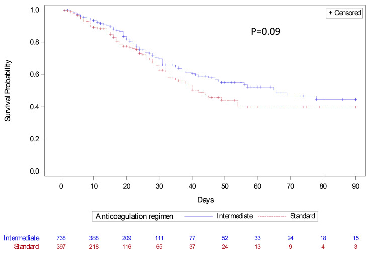 Results: Of 1174 included patients (mean age, 63 years), 399 received standard-dose and 775 intermediate-dose prophylactic anticoagulation. Of the 211 patients who died within 90 days, 86 (21%) received intermediate and 125 (16%) standard doses. After adjustment on early corticosteroid therapy and critical illness severity, there were no significant between-group differences in day-90 mortality (hazard ratio [HR], 0.73; 95%CI, 0.52-1.04; p = 0.09) or ICU stay length (HR, 0.93; 95%CI, 0.79-1.10; p = 0.38). Intermediate-dose anticoagulation was significantly associated with fewer VTE events (HR, 0.55; 95%CI, 0.38-0.80; p < 0.001). Bleeding events occurred in similar proportions of patients in the two groups (odds ratio, 0.86; 95%CI, 0.50-1.47; p = 0.57).