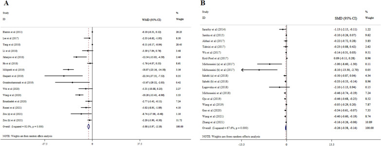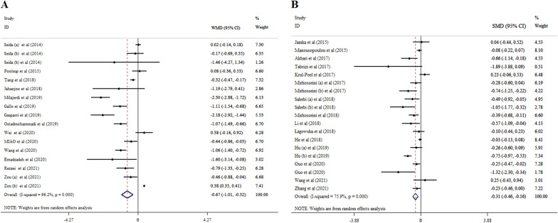 Results: Our findings indicated that vitamin D supplementation significantly decreased fasting blood sugar (FBS) (WMD = - 3.08; 95% CI: - 3.97, - 2.19, p < 0.001, and SMD = - 0.26; 95% CI: - 0.38, - 0.14, p < 0.001), hemoglobin A1c (HbA1c) (WMD = - 0.05; 95% CI: - 0.10, - 0.01, p = 0.016, and SMD = - 0.16; 95% CI: - 0.27, - 0.05, p = 0.004), insulin concentrations (WMD = - 2.62; 95% CI: - 4.11, - 1.13; p < 0.001, and SMD = - 0.33; 95% CI: - 0.56, - 0.11, p = 0.004), and homeostatic model assessment for insulin resistance (HOMA-IR) (WMD = - 0.67; 95% CI: - 1.01, - 0.32, p < 0.001, and SMD = - 0.31; 95% CI: - 0.46, - 0.16, p < 0.001).