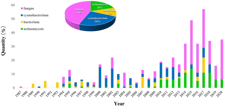 Natural products derived from marine microorganisms have received great attention as a potential resource of new compound entities for drug discovery. The unique marine environment brings us a large group of sulfur-containing natural products with abundant biological functionality including antitumor, antibiotic, anti-inflammatory and antiviral activities. We reviewed all the 484 sulfur-containing natural products (non-sulfated) isolated from marine microorganisms, of which 59.9% are thioethers, 29.8% are thiazole/thiazoline-containing compounds and 10.3% are sulfoxides, sulfones, thioesters and many others. A selection of 133 compounds was further discussed on their structure-activity relationships, mechanisms of action, biosynthesis, and druggability. This is the first systematic review on sulfur-containing natural products from marine microorganisms conducted from January 1987, when the first one was reported, to December 2020.