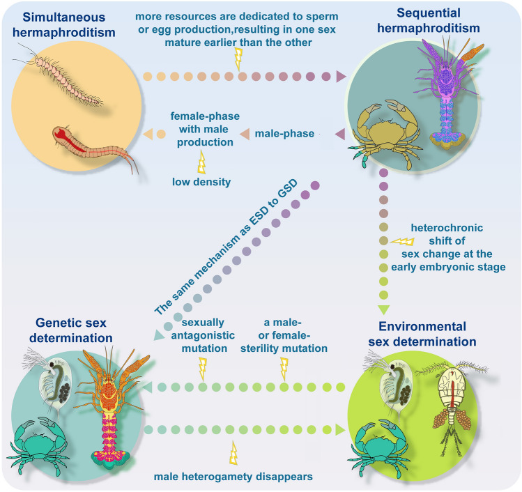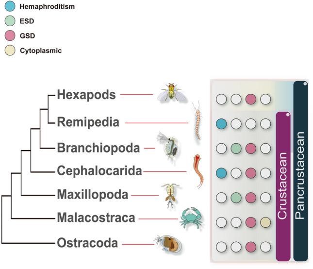 Sex determination (SD) involves mechanisms that determine whether an individual will develop into a male, female, or in rare cases, hermaphrodite. Crustaceans harbor extremely diverse SD systems, including hermaphroditism, environmental sex determination (ESD), genetic sex determination (GSD), and cytoplasmic sex determination (e.g., Wolbachia controlled SD systems). Such diversity lays the groundwork for researching the evolution of SD in crustaceans, i.e., transitions among different SD systems. However, most previous research has focused on understanding the mechanism of SD within a single lineage or species, overlooking the transition across different SD systems. To help bridge this gap, we summarize the understanding of SD in various clades of crustaceans, and discuss how different SD systems might evolve from one another. Furthermore, we review the genetic basis for transitions between different SD systems (i.e., Dmrt genes) and propose the microcrustacean Daphnia (clade Branchiopoda) as a model to study the transition from ESD to GSD.