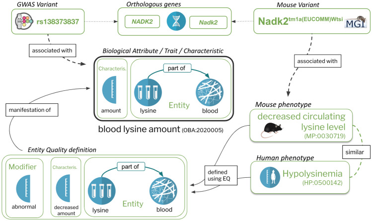 Existing phenotype ontologies were originally developed to represent phenotypes that manifest as a character state in relation to a wild-type or other reference. However, these do not include the phenotypic trait or attribute categories required for the annotation of genome-wide association studies (GWAS), Quantitative Trait Loci (QTL) mappings or any population-focussed measurable trait data. The integration of trait and biological attribute information with an ever increasing body of chemical, environmental and biological data greatly facilitates computational analyses and it is also highly relevant to biomedical and clinical applications. The Ontology of Biological Attributes (OBA) is a formalised, species-independent collection of interoperable phenotypic trait categories that is intended to fulfil a data integration role. OBA is a standardised representational framework for observable attributes that are characteristics of biological entities, organisms, or parts of organisms. OBA has a modular design which provides several benefits for users and data integrators, including an automated and meaningful classification of trait terms computed on the basis of logical inferences drawn from domain-specific ontologies for cells, anatomical and other relevant entities. The logical axioms in OBA also provide a previously missing bridge that can computationally link Mendelian phenotypes with GWAS and quantitative traits. The term components in OBA provide semantic links and enable knowledge and data integration across specialised research community boundaries, thereby breaking silos.
