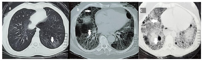 Conclusion: The total lung score and GGO score in ARD were found to be consistently significantly correlated with FVC% predicted, PaO2, inflammatory markers, and RV functions. Fibrotic score correlated with ESPAP. Therefore, in a clinical setting, most clinicians who monitor patients suffering from ARD should concern with the applicability of semiquantitative HRCT scoring in clinical practice.