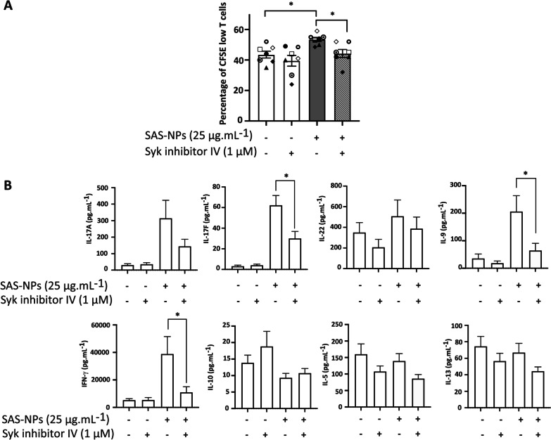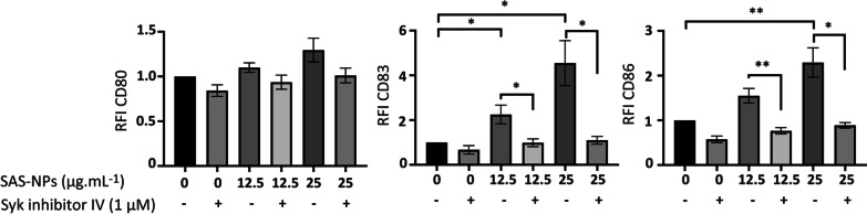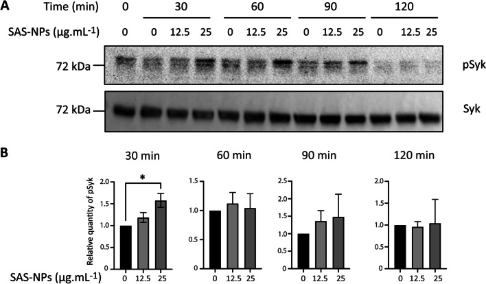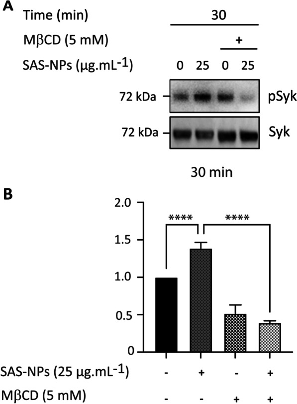 Results: In human monocyte-derived dendritic cells (moDCs) exposed to SAS-NPs, Syk inhibition prevented the induction of CD83 and CD86 marker expression. A significant decrease in T-cell proliferation and IFN-γ, IL-17F and IL-9 production was found in an allogeneic moDC:T-cell co-culture model. These results suggested that the activation of Syk was necessary for optimal co-stimulation of T-cells. Moreover, Syk phosphorylation, observed 30 min after SAS-NP exposure, occurred upstream of the c-Jun N-terminal kinase (JNK) Mitogen-activated protein kinases (MAPK) and was elicited by the Src family of protein tyrosine kinases. Our results also showed for the first time that SAS-NPs provoked aggregation of lipid rafts in moDCs and that MβCD-mediated raft destabilisation altered Syk activation.