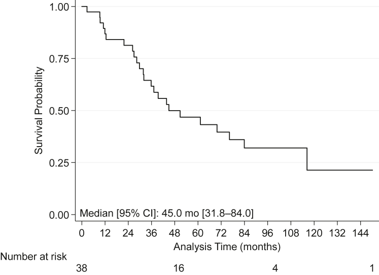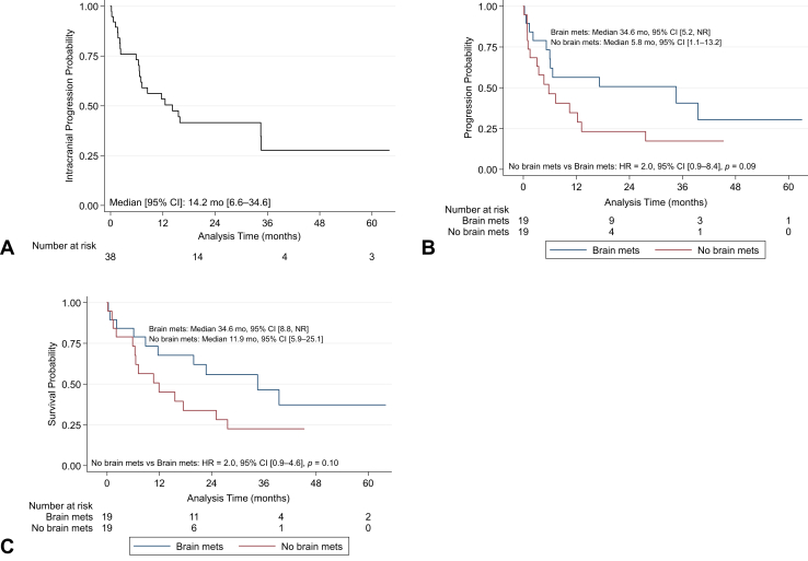 Results: The population (N = 38, 10 sites) was heavily pretreated (23 had ≥2 previous treatment lines) with a high disease burden (26 had 2-4 sites and 11 had >4 sites of metastatic disease, 19 had brain metastases). The overall response rate was 44% and the disease control rate was 81%. Lorlatinib dose reduction (18%), interruption (16%), and discontinuation (3%) were consistent with the trial experience. From advanced ALK+ diagnosis, the median OS for populations a, b, and c was 45.0 months, 69.9 months and 61.2 months respectively. From lorlatinib initiation, the median PFSa, PFSb and PFSc was 7.3 months, 13.2 months and 27.7 months and the median OSa, OSb and OSc was 19.9 months, 25.1 months and 27.7 months. The median PFSa with versus without brain metastases was 34.6 months versus 5.8 months (p = 0.09). The intracranial median PFS was 14.2 months. Previous good response versus poor response to the first ALK-directed therapy median PFSa was 27.7 months versus 4.7 months with a hazard ratio of 0.3 (p = 0.01).