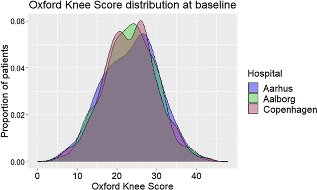 Results: Baseline data was provided by 1452 patients (89% of included patients, 56% of available patients). Patients in Copenhagen (Herlev-Gentofte Hospital, high-revision) were older (68.6 ± 9 years) than those in low-revision hospitals (Aarhus 66.6 ± 10 y. and Aalborg (Farsø) 67.3 ± 9 y., p = 0.002). In Aalborg, patients who had higher Body Mass Index (mean 30.2 kg/m2 versus 28.2 (Aarhus) and 28.7 kg/m2 (Copenhagen), p < 0.001), were more likely to be male (56% versus 45 and 43%, respectively, p = 0.002), and exhibited fewer anxiety and depression symptoms (EQ-5D-5L) (24% versus 34 and 38%, p = 0.01). The preoperative Oxford Knee Score (23.3 ± 7), UCLA Activity Scale (4.7 ± 2), range of motion (Copenhagen Knee ROM Scale) and patient motivations were comparable across hospitals but varied with implant type. Radiological classification ≥ 2 was observed in 94% (Kellgren-Lawrence) and 67% (Ahlbäck) and was more frequent in Aarhus (low-revision) (p ≤ 0.02), where unicompartmental implants were utilized most (49% versus 14 (Aalborg) and 23% (Copenhagen), p < 0.001). In the Capital Region (Copenhagen), the incidence of surgery was 15-28% higher (p < 0.001).