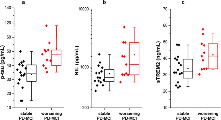 Pathophysiological substrate(s) and progression of Parkinson's disease (PD) with mild cognitive impairment (PD-MCI) are still matter of debate. Baseline cerebrospinal fluid (CSF) neurochemical profile and cognitive changes after 2 years were investigated in a retrospective series of PD-MCI (n = 48), cognitively normal PD (PD-CN, n = 40), prodromal Alzheimer's disease (MCI-AD, n = 25) and cognitively healthy individuals with other neurological diseases (OND, n = 44). CSF biomarkers reflecting amyloidosis (Aβ42/40 ratio, sAPPα, sAPPβ), tauopathy (p-tau), neurodegeneration (t-tau, NfL, p-NfH), synaptic damage (α-syn, neurogranin) and glial activation (sTREM2, YKL-40) were measured. The great majority (88%) of PD-MCI patients was A-/T-/N-. Among all biomarkers considered, only NfL/p-NfH ratio was significantly higher in PD-MCI vs. PD-CN (p = 0.02). After 2 years, one-third of PD-MCI patients worsened; such worsening was associated with higher baseline levels of NfL, p-tau, and sTREM2. PD-MCI is a heterogeneous entity requiring further investigations on larger, longitudinal cohorts with neuropathological verification.