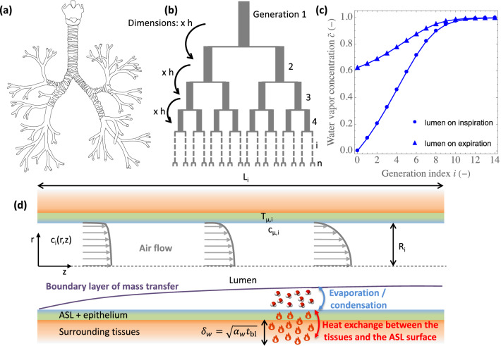 A secondary function of the respiratory system of the mammals is, during inspiration, to heat the air to body temperature and to saturate it with water before it reaches the alveoli. Relying on a mathematical model, we propose a comprehensive analysis of this function, considering all the terrestrial mammals (spanning six orders of magnitude of the body mass, M) and focusing on the sole contribution of the lungs to this air conditioning. The results highlight significant differences between the small and the large mammals, as well as between rest and effort, regarding the spatial distribution of heat and water exchanges in the lungs, and also in terms of regime of mass transfer taking place in the lumen of the airways. Interestingly, the results show that the mammalian lungs appear to be designed just right to fully condition the air at maximal effort (and clearly over-designed at rest, except for the smallest mammals): all generations of the bronchial region of the lungs are mobilized for this purpose, with calculated values of the local evaporation rate of water from the bronchial mucosa that can be very close to the maximal ability of the serous cells to replenish this mucosa with water. For mammals with a mass above a certain threshold ([Formula: see text] kg at rest and [Formula: see text] g at maximal effort), it appears that the maximal value of this evaporation rate scales as [Formula: see text] at rest and [Formula: see text] at maximal effort and that around 40% (at rest) or 50% (at maximal effort) of the water/heat extracted from the lungs during inspiration is returned to the bronchial mucosa during expiration, independently of the mass, due to a subtle coupling between different phenomena. This last result implies that, above these thresholds, the amounts of water and heat extracted from the lungs by the ventilation scale with the mass such as the ventilation rate does (i.e. as [Formula: see text] at rest and [Formula: see text] at maximal effort). Finally, it is worth to mention that these amounts appear to remain limited, but not negligible, when compared to relevant global quantities, even at maximal effort (4-6%).