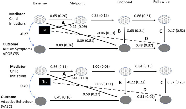 Results: Good model fits were obtained. The treatment effect on child dyadic initiation with the caregiver was sustained through the follow-up period. Increased child initiation at treatment midpoint mediated the majority (73%) of the treatment effect on follow-up ADOS CSS. A combination of partial mediation from midpoint child initiations and the direct effect of treatment also contributed to a near-significant total effect on follow-up TVABS. No moderation of this mediation was found for AE, CSBS or IS.