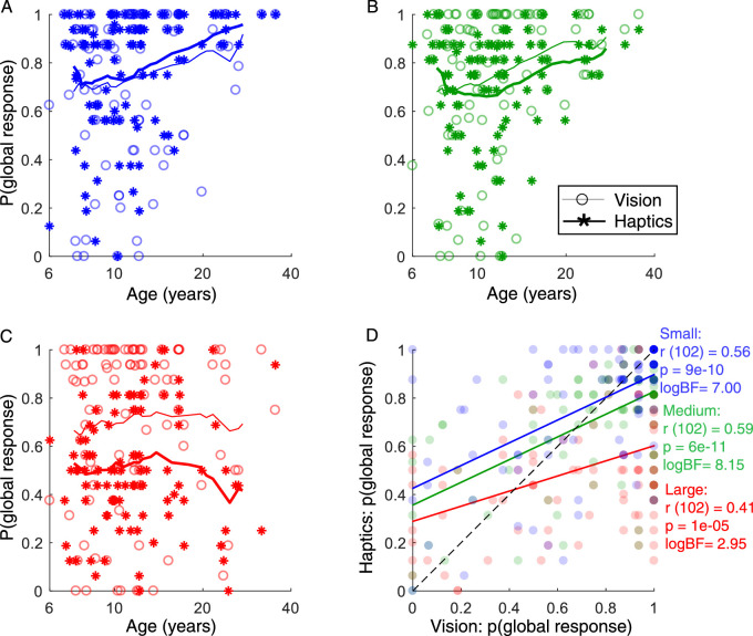 We aimed to advance our understanding of local-global preference by exploring its developmental path within and across sensory modalities: vision and haptics. Neurotypical individuals from six years of age through adulthood completed a similarity judgement task with hierarchical haptic or visual stimuli made of local elements (squares or triangles) forming a global shape (a square or a triangle). Participants chose which of two probes was more similar to a target: the one sharing the global shape (but different local shapes) or the one with the same local shapes (but different global shape). Across trials, we independently varied the size of the local elements and that of the global configuration-the latter was varied by manipulating local element density while keeping their numerosity constant. We found that the size of local elements (but not global size) modulates the effects of age and modality. For stimuli with smaller local elements, the proportion of global responses increased with age and was similar for visual and haptic stimuli. However, for stimuli made of our largest local elements, the global preference was reduced or absent, particularly in haptics, regardless of age. These results suggest that vision and haptics progressively converge toward similar global preference with age, but residual differences across modalities and across individuals may be observed, depending on the characteristics of the stimuli.