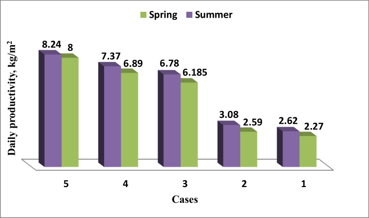 Solar stills are used in distant and arid areas to convert brackish or salty water into potable water fit for human use in a simple, affordable, and effective manner. Even when PCM materials are used, typical solar systems still have minimal production per day. In this study, experimental tests were carried out in order to increase the performance of a single-slope solar still combined with PCM material (paraffin wax) and a solar-powered electric heater. Two identical single-slope solar stills were designed, fabricated, and tested under the same climatic conditions during the summer and spring seasons of 2021 in Al-Arish, Egypt. The first is a conventional solar still (CVSS), and the other is also a conventional still but with PCM and an electric heater (CVSSWPCM). Several parameters were measured during the experiments, including sun intensity, meteorological aspects, cumulative freshwater production, average glass, and water temperatures and PCM temperature. The improved solar still was evaluated at different operating temperatures and was compared to the conventional traditional one. There were four cases studied: one case without a heater (paraffin wax only) and three other cases with a heater operating at 58 °C, 60 °C, and 65 °C, respectively. The experimental results revealed that activating the heater inside the paraffin wax increased daily production (i) in the spring by 2.38, 2.66, and 3.1 times and (ii) and in the summer by 2.2, 2.39, and 2.67 times at the three above-mentioned temperatures respectively (when compared to the traditional still). In addition, the maximum rate of daily freshwater production was achieved at paraffin wax temperature of 65 °C in both spring and summer (Case 5). Finally, the economic evaluation of the modified solar still was carried out according to cost per litre. The modified solar still with a heater operating at 65 °C has a higher exergoeconomic value than the traditional one. The maximum CO2 mitigation in cases 1 and 5 was approximately 28 tons and 160 tons, respectively.