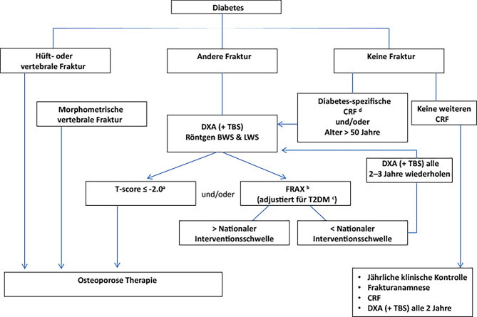 Patient: innen mit Diabetes mellitus und einem erhöhten Frakturrisiko sollten genauso wie Patient:innen ohne Diabetes und einem erhöhten Frakturrisiko behandelt werden.Der Vitamin-D-Spiegel sollte auf jeden Fall immer optimiert werden und auf eine ausreichende Kalziumaufnahme (vorzugsweise durch die Nahrung) ist zu achten.Bei der Wahl der antihyperglykämischen Therapie sollten Substanzen mit nachgewiesen negativem Effekt auf den Knochen weggelassen werden. Bei Vorliegen einer Fragilitätsfraktur ist auf jeden Fall – unabhängig von allen vorliegenden Befunden – eine langfristige spezifische osteologische Therapie indiziert.Zur Prävention von Fragilitätsfrakturen sind antiresorptive Medikamente die erste Wahl, entsprechend den nationalen Erstattungskriterien auch anabole Medikamente. Das Therapiemonitoring soll im Einklang mit der nationalen Osteoporose Leitlinie erfolgen.
