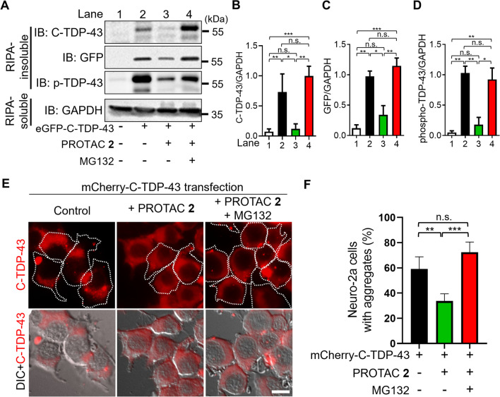Results: Four PROTACs with different linker lengths were synthesized and characterized. Among these chimeras, PROTAC 2 decreased C-TDP-43 aggregates and relieved C-TDP-43-induced cytotoxicity in Neuro-2a cells without affecting endogenous TDP-43. We showed that PROTAC 2 bound to C-TDP-43 aggregates and E3 ligase to initiate ubiquitination and proteolytic degradation. By applying advanced microscopy, it was further shown that PROTAC 2 decreased the compactness and population of C-TDP-43 oligomers. In addition to cellular model, PROTAC 2 also improved the motility of transgenic C. elegans by reducing the C-TDP-43 aggregates in the nervous system.