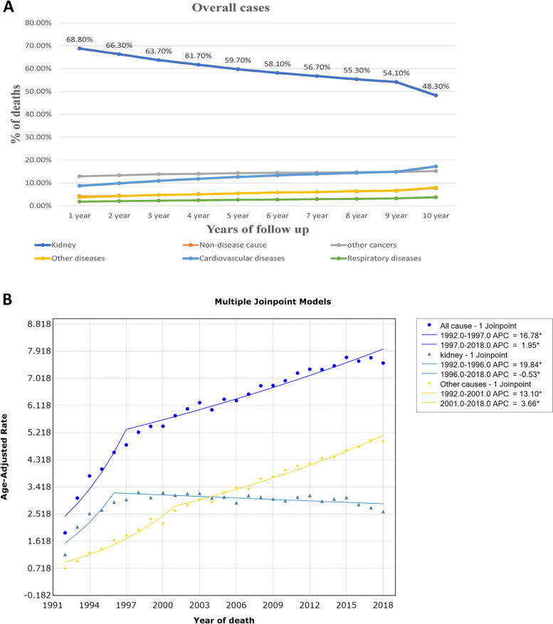 Method: We used the Surveillance, Epidemiology, and End Results (SEER) (1992-2018) database to get patients with RCC. We calculated the percentage of total deaths of six kinds of the cause of death (COD) and the cumulative incidence of death for each selected cause over survival time. The joinpoint regression was utilized to present the trend of mortality rate by COD.