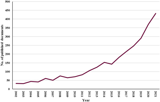 The scientific community widely acknowledges that the gut microbiota plays a critical role in maintaining host health and can be altered by a range of factors, such as antibiotic use, diet, stress, and infections. Therefore, this study utilized bibliometric analysis to thoroughly investigate research trends in the microbiota and antibiotics. Scopus was used to extract papers linked to microbiota and antibiotics published between 2002 and 2021, and both Microsoft Excel and VOSviewer were used to conduct the analysis of the data. A total of 2,816 publications discussed the connection between the microbiota and antibiotics. Growth occurred in two stages: the first (2002-2015) was characterized by fairly slow publication production, while the second (2016-2021) saw a rapid increase in publishing progress. The United States has the most publications, 654, representing 23.22% of the total. China came second with 372 publications (13.21%), followed by the United Kingdom with 161 publications (5.72%) and India with 157 publications (5.58%). In addition, publications on 'altered intestinal microbiota composition with antibiotic treatment' were introduced after 2017, while 'gut microbiota and antimicrobial resistance' and 'probiotics as an alternative antimicrobial therapy' were introduced before 2017. Based on these results, this study provides an in-depth look at key moments in the history of microbiota and antibiotic research, as well as possible directions for future research in different areas of microbiota and antibiotic research. Therefore, it is suggested that more attention should be given to the latest promising hotspots, such as how antibiotic treatment changes the composition of the gut microbiota.