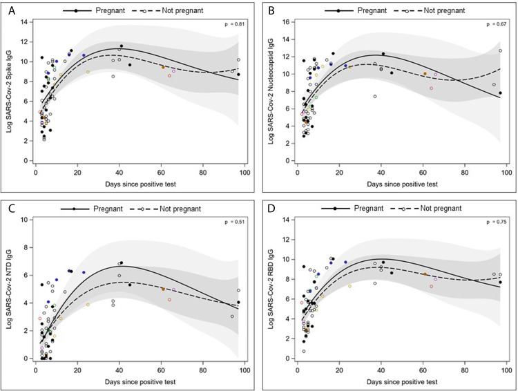 Results: The median number of days from first positive test to sampling was 6.5 in the pregnant group (range, 3-97) and 6.0 among nonpregnant participants (range, 2-97). No significant differences in demographic or sampling characteristics were noted between the groups. No differences in immunoglobulin G or immunoglobulin M levels over time or mean antibody levels were noted among pregnant and nonpregnant participants following SARS-CoV-2 infection for any of the SARS-CoV-2 antigen targets examined (spike, spike receptor-binding domain, spike N-terminal domain, and nucleocapsid). Participants who were vaccinated during pregnancy had higher immunoglobulin G levels than pregnant patients who tested positive for all SARS-CoV-2 targets except nucleocapsid antibodies (all P<.001) and had lower immunoglobulin M spike (P<.05) and receptor-binding domain (P<.01) antibody levels.