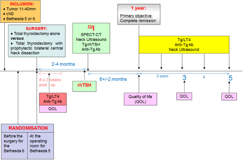 Trial design and methods: Prospective randomized open multicenter phase III trial including patients with 11-40-mm papillary thyroid carcinoma (Bethesda VI) or suspicious cytology (Bethesda V) confirmed malignant on intra-operative frozen section analysis, with no suspicious lymph nodes on a specialized preoperative ultrasound examination. Patients will be randomized 1:1 into two groups: the reference group total thyroidectomy with bilateral prophylactic central neck dissection, and the comparator group total thyroidectomy alone. All patients will receive an ablative dose of 30mCi of radioactive iodine (RAI) within 4 months of surgery. The primary outcome is to compare the rate of excellent response at 1 year after surgery between the groups, as defined by an unstimulated serum thyroglobulin (Tg) level ≤ 0.2 ng/mL with no anti-Tg antibodies, an normal neck ultrasound and no ectopic uptake on the post-RAI scintiscan. Non-inferiority will be demonstrated if the rate of patients with excellent response at 1 year after randomization does not differ by more than 5%. Setting the significance level at 0.025 (one-sided) and a power of 80% requires a sample size of 598 patients (299 per group). Secondary outcomes are to compare Tg levels at 8 +/- 2 postoperative weeks, before RAI ablation, the rate of excellent response at 3 and 5 years, the rate of other responses at 1, 3, and 5 years (biochemical incomplete, indeterminate, and structurally incomplete responses), complications, quality of life, and cost-utility.