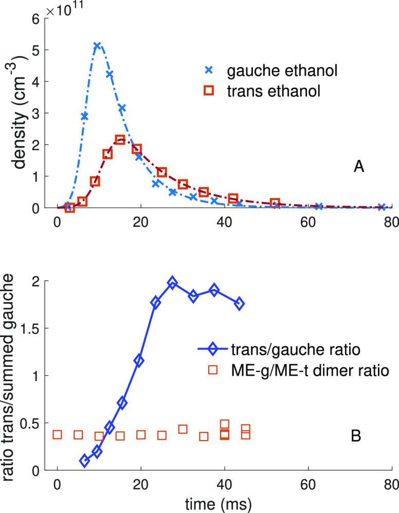 The structures of gas-phase noncovalently bound clusters have long been studied in supersonic expansions. This method of study, while providing a wealth of information about the nature of noncovalent bonds, precludes observation of the formation of the cluster, as the clusters form just after the orifice of the pulsed valve. Here, we directly observe formation of ethanol-methanol dimers via microwave spectroscopy in a controlled cryogenic environment. Time profiles of the concentration of reagents in the cell yielded gas-phase reaction rate constants of kMe-g = (2.8 ± 1.4) × 10-13 cm3 molecule-1 s-1 and kMe-t = (1.6 ± 0.8) × 10-13 cm3 molecule-1 s-1 for the pseudo-second-order ethanol-methanol dimerization reaction at 8 K. The relaxation cross section between the gauche and trans conformers of ethanol was also measured using the same technique. In addition, thermodynamic relaxation between conformers of ethanol over time allowed for selection of conformer stoichiometry in the ethanol-methanol dimerization reaction, but no change in the ratio of dimer conformers was observed with changing ethanol monomer stoichiometry.