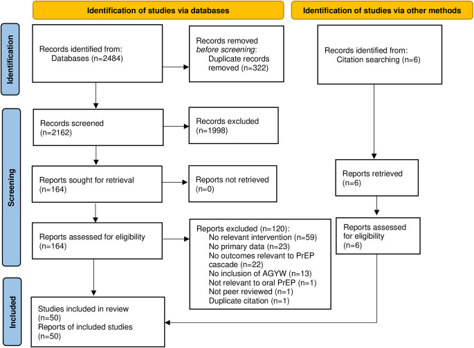 Las adolescentes y las mujeres jóvenes se ven afectadas de forma desproporcionada por el VIH, y la Profilaxis Pre-Exposición oral (PrEP) puede reducir la adquisición del VIH. El propósito de esta revisión de alcance fue sintetizar los resultados de las intervenciones a lo largo del continuo de la PrEP para las adolescentes y las mujeres jóvenes con el fin de informar la investigación y los programas. Se realizaron búsquedas en bases de datos electrónicas de estudios publicados entre enero 2012 a julio 2021 y se llevó a cabo una búsqueda secundaria de referencias. Los estudios se incluyeron si evaluaban intervenciones para aumentar el interés, la iniciación, o la continuación de la PrEP entre las adolescentes y las mujeres jóvenes. Los resultados se sintetizaron narrativamente. De las 2168 citas identificadas, 50 estudios fueron elegibles para inclusión y 20 contenían datos específicos de las adolescentes y las mujeres jóvenes. Entre las adolescentes y las mujeres jóvenes cisgénero y transgénero, los estudios demostraron un impacto positivo en el interés y la iniciación de la PrEP, pero en general alcanzaron tasas de continuación subóptimas. Los resultados demuestran la viabilidad del despliegue de la PrEP en diversos entornos—en particular cuando las intervenciones son estratificadas, se adaptan a las adolescentes y las mujeres jóvenes, e incluyen una prestación diferenciada—pero también destacan las lagunas de conocimiento y la necesidad de una métrica más holística del éxito.