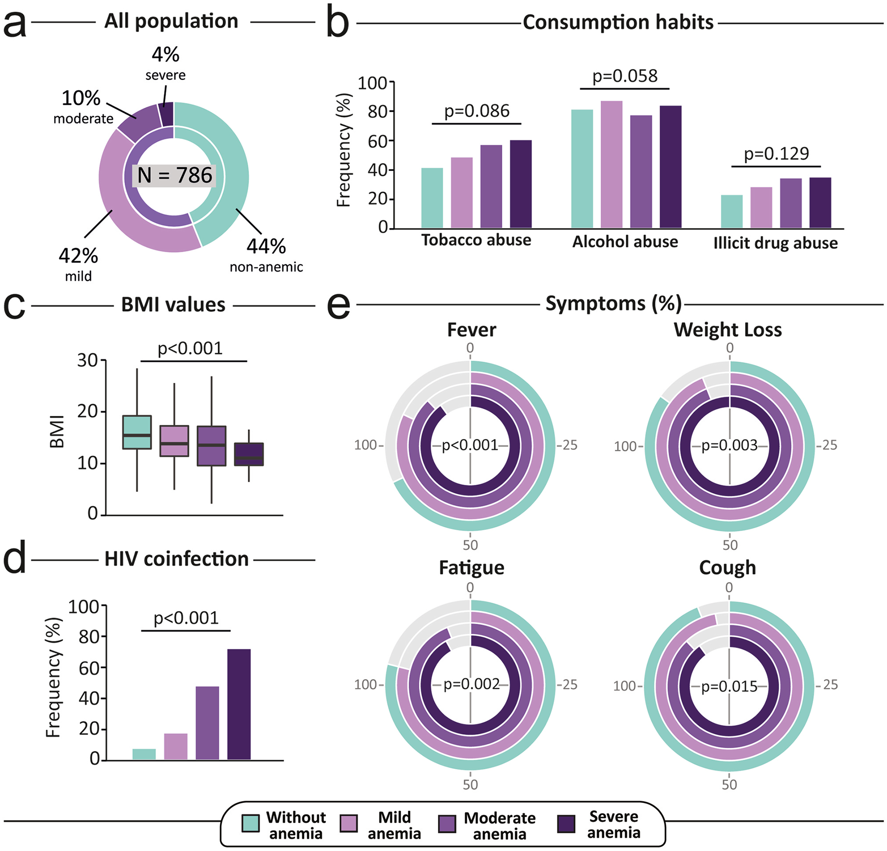 Results: Among 786 participants who met inclusion criteria, 441 (56 %) were anemic at baseline. Patients with moderate/severe anemia were more HIV-seropositive, as well as more symptomatic and had higher frequencies of unfavorable outcomes compared to the other groups. Moderate/severe anemia (adjusted OR [aOR]: 7.80, 95 %CI:1.34-45.4, p = 0.022) was associated with death independent of sex, age, BMI, HIV and glycemic status.