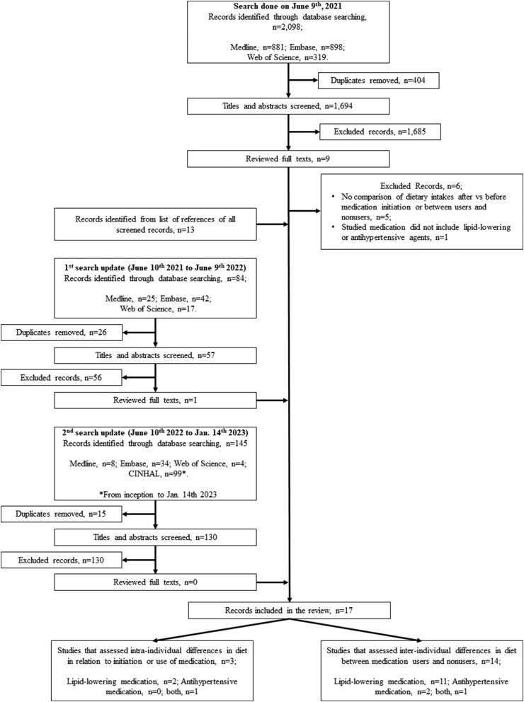 In cardiovascular disease (CVD) prevention, whether antihypertensive and lipid-lowering medications are used as complements to heart-healthy diets has not been thoroughly assessed. This scoping review aimed to 1) analyze observational studies that assessed the relationship between diet and antihypertensive/lipid-lowering medication use and 2) evaluate whether medication was used as a complement to heart-healthy dietary intakes. We searched MEDLINE, Embase, Web of Science, and CINAHL through 14 January, 2023, for studies that assessed either 1) intraindividual changes in diet associated with lipid-lowering/antihypertensive medication initiation or use or 2) interindividual differences in diet between users and nonusers of these medications. A total of 17 studies were included. Of those, 3 prospectively assessed the intraindividual changes in diet associated with medication initiation or use, but none documented potential changes in diet prior to medication initiation. The 14 other studies compared dietary intakes of medication users and nonusers, most of which also relied on an incomplete assessment of the temporal dynamics between diet and medication use as they employed cross-sectional (n = 12) or repeated cross-sectional (n = 2) designs. Data from 8 studies, including 4 of the 5 studies from Europe, suggested that medication was used as a complement to heart-healthy diets, whereas data from the 9 other studies, including the 4 conducted in the United States, provided no such evidence, indicating potential between-country differences in this relationship. Finally, no studies investigated how the dynamics between diet and medication use influenced the long-term CVD risk. This scoping review suggests that the current literature on the relationship between lipid-lowering/antihypertensive medication use and diet provides an incomplete perspective on how medication may influence diet in CVD prevention. Prospective studies assessing intraindividual changes in diet associated with medication initiation and use and how these dynamics influence the CVD risk are thus needed.