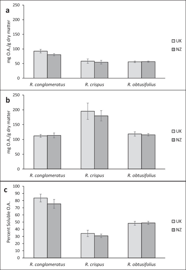 Compared to their native range, non-native plants often experience reduced levels of herbivory in the introduced range. This may result in reduced pressure to produce chemical defences that act against herbivores. We measured the most abundant secondary metabolites found in Rumex spp., namely oxalates, phenols and tannins. To test this hypothesis, we compared native (UK) and introduced (NZ) provenances of three different Rumex species (R. obtusifolius, R. crispus and R. conglomeratus, Polygonaceae) to assess whether any significant differences existed in their levels of chemical defences in either leaves and roots. All three species have previously been shown to support a lower diversity of insect herbivores and experience less herbivory in the introduced range. We further examined leaf herbivory on plants from both provenances when grown together in a common garden experiment in New Zealand to test whether any differences in damage might be consistent with variation in the quantity of chemical defences. We found that two Rumex species (R. obtusifolius and R. crispus) showed no evidence for a reduction in chemical defences, while a third (R. conglomeratus) showed only limited evidence. The common garden experiment revealed that the leaves analysed had low levels of herbivory (~ 0.5%) with no differences in damage between provenances for any of the three study species. Roots tended to have a higher concentration of tannins than shoots, but again showed no difference between the provenances. As such, the findings of this study provide no evidence for lower plant investments in chemical defences, suggesting that other factors explain the success of Rumex spp. in New Zealand.