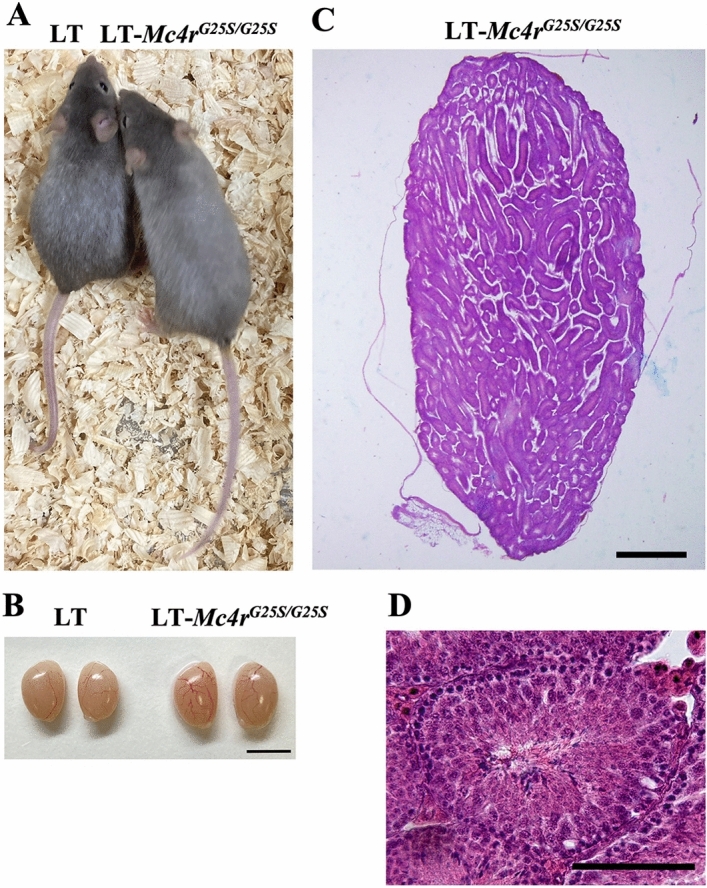 Teratomas in mice, composed of different tissue types, are derived from primordial germ cells in the fetal gonads. Previously, we identified a locus responsible for experimental testicular teratoma (ETT) formation on chromosome 18, referred to as ett1. The strongest candidate sequence in the ett1 locus was found to be a missense mutation in the melanocortin 4 receptor (Mc4r), Mc4rG25S. We established a strain with a point mutation in the Mc4r gene in the ETT-nonsusceptible LT strain, called LT- Mc4rG25S, by genome editing. Surprisingly, highly developed ovarian teratomas (OTs), rather than testicular teratomas, appeared in the LT-Mc4rG25S strain. The results demonstrated that Mc4r is also one of the genes responsible for OT formation and suggested that missense mutations in Mc4r promote teratoma formation in both sexes. In this study, we performed ETT experiments in different host-graft combinations of the LT-Mc4rG25S and LT strains. Furthermore, the expression of MC4R in germ cells in the testis was demonstrated. Expression of Mc4r in testis was also confirmed by RT-PCR. The results demonstrated that MC4R is expressed in germ cells in the testis and that a point mutation in the Mc4r gene is responsible for ETT formation.