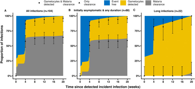 Malaria transmission depends on the presence of Plasmodium gametocytes that are the only parasite life stage that can infect mosquitoes. Gametocyte production varies between infections and over the course of infections. Infection duration is highly important for gametocyte production but poorly quantified. Between 2017 and 2019 an all-age cohort of individuals from Tororo, eastern Uganda was followed by continuous passive and routine assessments. We longitudinally monitored 104 incident infections from 98 individuals who were sampled once every 28 days and on any day of symptoms. Among infections that lasted ≥ 3 months, gametocyte appearance was near-universal with 96% of infections having detectable gametocytes prior to clearance. However, most infections were of much shorter duration; 55.7% of asymptomatic infections were detected only once. When considering all asymptomatic infections, regardless of their duration, only 36.3% had detectable gametocytes on at least one time-point prior to parasite clearance. Infections in individuals with sickle-cell trait (HbAS) were more likely to have gametocytes detected (Hazard Rate (HR) = 2.68, 95% CI 1.12, 6.38; p = 0.0231) and had gametocytes detected at higher densities (Density Ratio (DR) = 9.19, 95% CI 2.79, 30.23; p = 0.0002) compared to infections in wildtype (HbAA) individuals. Our findings suggest that a large proportion of incident infections is too short in duration and of too low density to contribute to onward transmission.