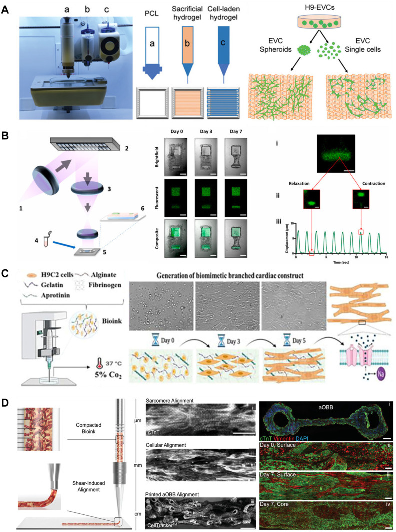 Purpose of review: Bioengineering of functional cardiac tissue composed of primary cardiomyocytes has great potential for myocardial regeneration and in vitro tissue modeling. 3D bioprinting was developed to create cardiac tissue in hydrogels that can mimic the structural, physiological, and functional features of native myocardium. Through a detailed review of the 3D printing technologies and bioink materials used in the creation of a heart tissue, this article discusses the potential of engineered heart tissues in biomedical applications.