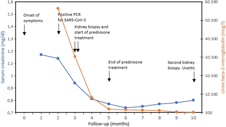 Case-diagnosis/treatment: A 12-year-old girl was assessed for a mild elevation of serum creatinine detected during the evaluation of systemic manifestations including asthenia, anorexia, abdominal pain, vomiting, and weight loss. Data of incomplete proximal tubular dysfunction (hypophosphatemia and hypouricemia with inappropriate urinary losses, low molecular weight proteinuria, and glucosuria) were also associated. Symptoms had initiated after a febrile respiratory infection with no known infectious cause. After 8 weeks, the patient tested positive in PCR for SARS-CoV-2 (Omicron variant). A subsequent percutaneous kidney biopsy revealed TIN and immunofluorescence staining with confocal microscopy detected the presence of SARS-CoV-2 protein S within the kidney interstitium. Steroid therapy was started with gradual tapering. Ten months after onset of clinical manifestations, as serum creatinine remained slightly elevated and kidney ultrasound showed mild bilateral parenchymal cortical thinning, a second percutaneous kidney biopsy was performed, without demonstrating acute inflammation or chronic changes, but SARS-CoV-2 protein S within the kidney tissue was again detected. At that moment, simultaneous routine ophthalmological examination revealed an asymptomatic bilateral anterior uveitis.