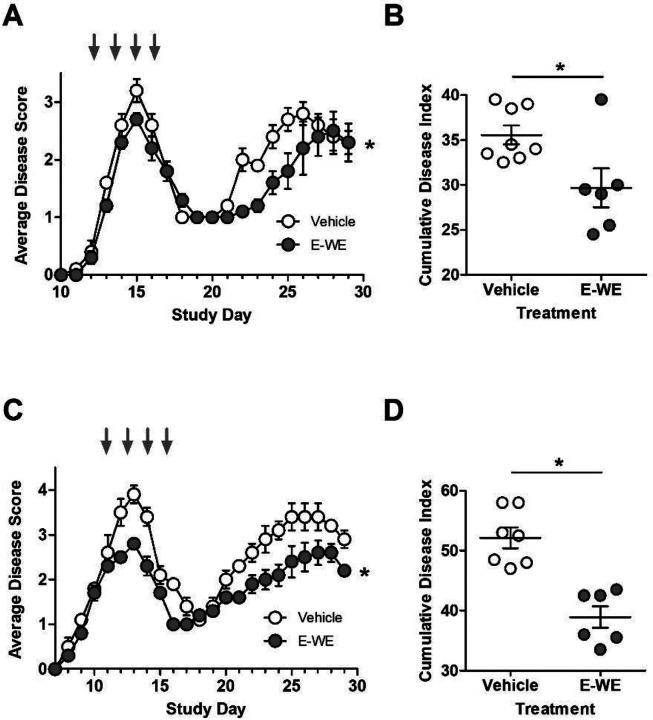 Methods: Female SJL mice were inoculated with proteolipid protein (PLP) peptide and treated with E-WE thrombin (25 μg/kg; iv) or vehicle at onset of detectable disease. In other experiments, E-WE thrombin was compared to methylprednisolone (100 mg/kg; iv) or the combination of both.