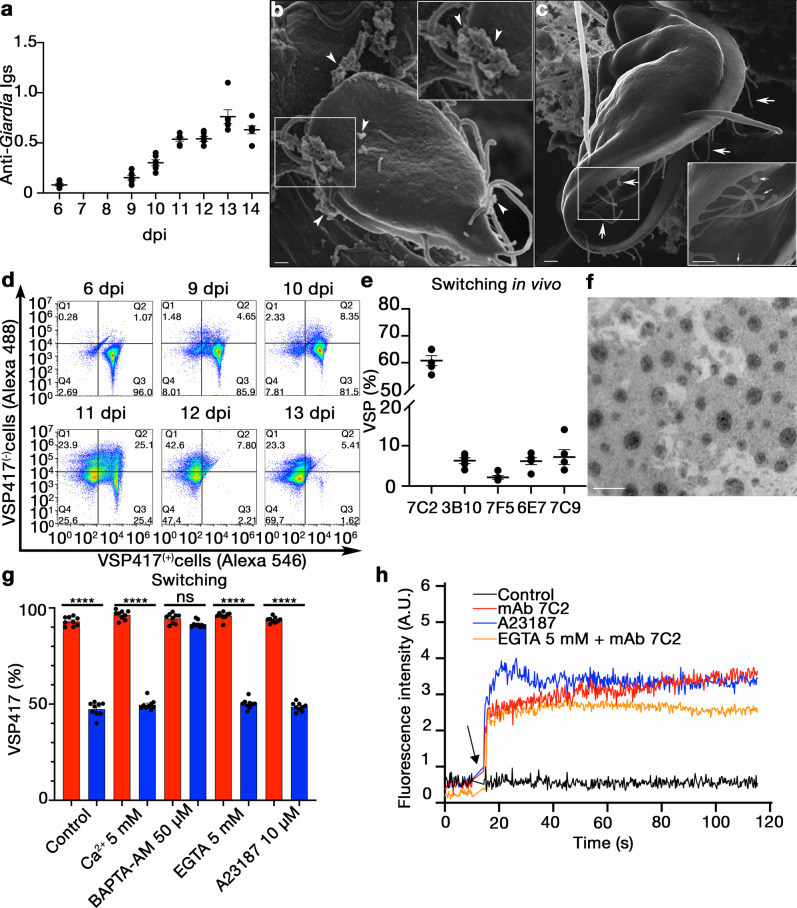 The genomes of most protozoa encode families of variant surface antigens. In some parasitic microorganisms, it has been demonstrated that mutually exclusive changes in the expression of these antigens allow parasites to evade the host's immune response. It is widely assumed that antigenic variation in protozoan parasites is accomplished by the spontaneous appearance within the population of cells expressing antigenic variants that escape antibody-mediated cytotoxicity. Here we show, both in vitro and in animal infections, that antibodies to Variant-specific Surface Proteins (VSPs) of the intestinal parasite Giardia lamblia are not cytotoxic, inducing instead VSP clustering into liquid-ordered phase membrane microdomains that trigger a massive release of microvesicles carrying the original VSP and switch in expression to different VSPs by a calcium-dependent mechanism. This novel mechanism of surface antigen clearance throughout its release into microvesicles coupled to the stochastic induction of new phenotypic variants not only changes current paradigms of antigenic switching but also provides a new framework for understanding the course of protozoan infections as a host/parasite adaptive process.