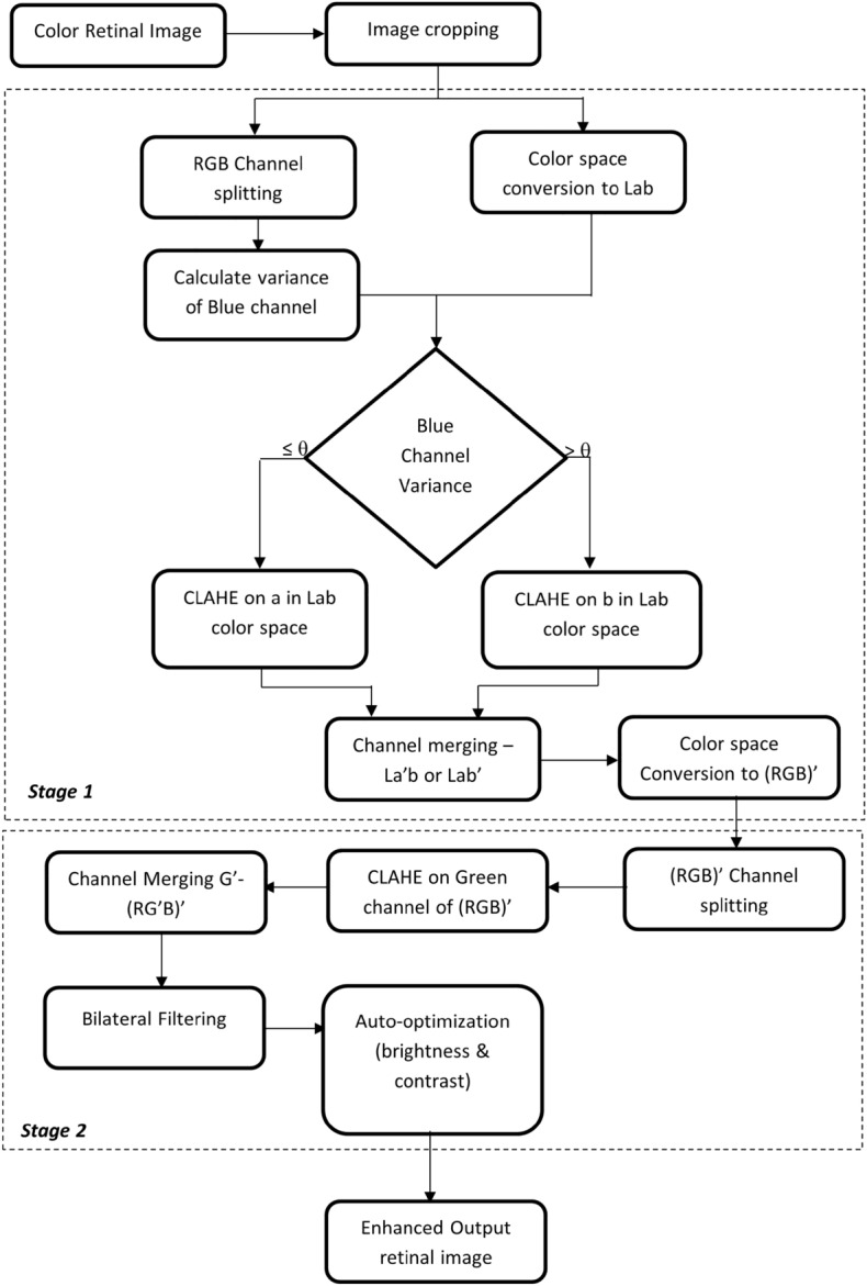 Real-time fundus images captured to detect multiple diseases are prone to different quality issues like illumination, noise, etc., resulting in less visibility of anomalies. So, enhancing the retinal fundus images is essential for a better prediction rate of eye diseases. In this paper, we propose Lab color space-based enhancement techniques for retinal image enhancement. Existing research works does not consider the relation between color spaces of the fundus image in selecting a specific channel to perform retinal image enhancement. Our unique contribution to this research work is utilizing the color dominance of an image in quantifying the distribution of information in the blue channel and performing enhancement in Lab space followed by a series of steps to optimize overall brightness and contrast. The test set of the Retinal Fundus Multi-disease Image Dataset is used to evaluate the performance of the proposed enhancement technique in identifying the presence or absence of retinal abnormality. The proposed technique achieved an accuracy of 89.53 percent.