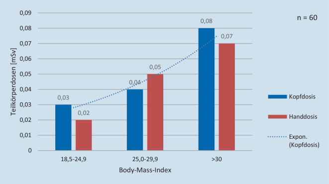 Ergebnisse: Es zeigte sich eine durchschnittliche Kopfdosis von 0,05 mSv pro Intervention (maximal 0,29 mSv) bei einem durchschnittlichen Dosisflächenprodukt (DFP) von 485,33 (21,7–3731,2) Gy/cm2. Signifikante Einflussfaktoren auf eine höhere Dosis waren ein höherer BMI des Patienten, eine längere Operationsdauer und ein höheres DFP. Das Erfahrungslevel des Operateurs zeigte keinen signifikanten Einfluss.
