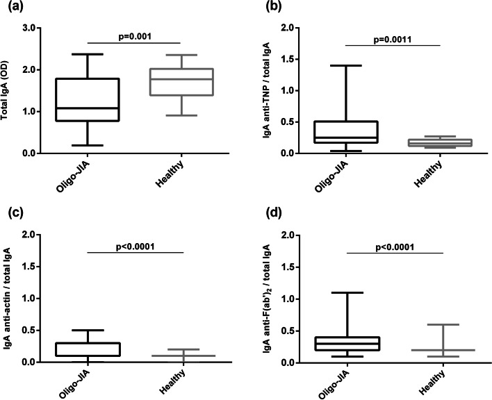 Methods: Seventy children with persistent oligo-JIA and 20 healthy matched controls were enrolled in the study. Serum IgM and IgA antibodies against human G-actin, human IgG F(ab΄)2 fragments and the hapten TriNitroPhenol (TNP) as well as the total concentration of serum IgM and IgA were measured by in-house enzyme-immunoassays. Kolmogorov-Smirnov normality test, Kruskal-Wallis H and Mann-Whitney tests were used to assess data distribution, and significant differences of non-parametric data between groups of the study. Backward regression analysis was used to analyze the effect of multiple factors (age, gender, disease activity, anti-nuclear antibody positivity, presence of uveitis) on continuous dependent variables (activities and activity/ concentration ratios of IgM and IgA NAbs).