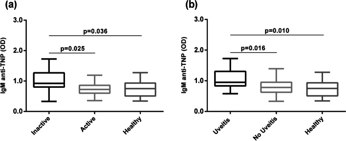Results: The ratios of IgA anti-TNP, anti-actin and anti-F(ab΄)2 levels to total serum IgA concentration were found to be significantly increased in patients with oligo-JIA compared to healthy subjects. Significantly elevated levels of IgM anti-TNP antibodies were also found in children with inactive oligo-JIA compared to those of children with active disease and of healthy controls. In the presence of anterior uveitis, IgM anti-TNP levels were significantly higher than in patients without uveitis or in healthy controls. Backward regression analysis revealed that the disease activity and the presence of anterior uveitis independently affect IgM anti-TNP levels.