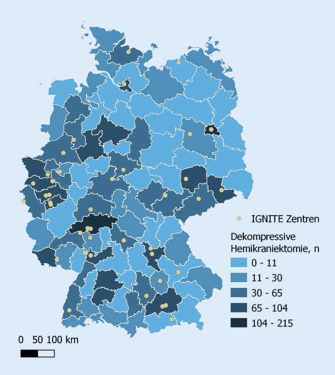 Diskussion: Die Ergebnisse zeigen eine bemerkenswerte Heterogenität in der Behandlungspraxis von Patienten/-innen mit malignem Mediainfarkt und insbesondere der Dauer der postoperativen Analgesie und Sedierung sowie Beatmung nach erfolgter Hemikraniektomie in Deutschland. Die Durchführung einer randomisierten Studie zur Sedierungsdauer nach Hemikraniektomie scheint gerechtfertigt.