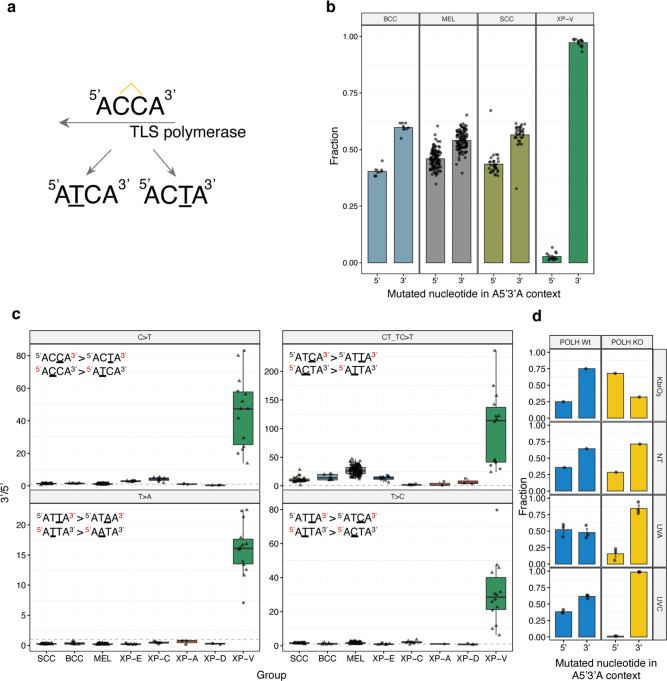 Xeroderma pigmentosum (XP) is a genetic disorder caused by mutations in genes of the Nucleotide Excision Repair (NER) pathway (groups A-G) or in Translesion Synthesis DNA polymerase η (V). XP is associated with an increased skin cancer risk, reaching, for some groups, several thousand-fold compared to the general population. Here, we analyze 38 skin cancer genomes from five XP groups. We find that the activity of NER determines heterogeneity of the mutation rates across skin cancer genomes and that transcription-coupled NER extends beyond the gene boundaries reducing the intergenic mutation rate. Mutational profile in XP-V tumors and experiments with POLH knockout cell line reveal the role of polymerase η in the error-free bypass of (i) rare TpG and TpA DNA lesions, (ii) 3' nucleotides in pyrimidine dimers, and (iii) TpT photodimers. Our study unravels the genetic basis of skin cancer risk in XP and provides insights into the mechanisms reducing UV-induced mutagenesis in the general population.