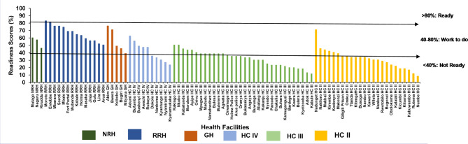 Methods: Referral hospitals managed severe COVID-19 patients, while lower-level health facilities screened, isolated, and managed mild cases. We assessed 17 of 20 referral hospitals in Uganda and 71 of 3,107 lower-level health facilities, selected using multistage sampling. We interviewed health facility heads in person about case management, coordination and communication and reporting, and preparation for the surge of COVID-19 during first and the start of the second waves of COVID-19, inspected COVID-19 treatment units (CTUs) and other service delivery points. We used an observational checklist to evaluate capacity in infection prevention, medicines, personal protective equipment (PPE), and CTU surge capacity. We used the "ReadyScore" criteria to classify readiness levels as > 80% ('ready'), 40-80% ('work to do'), and < 40% ('not ready') and tailored the assessments to the health facility level. Scores for the lower-level health facilities were weighted to approximate representativeness for their health facility type in Uganda.