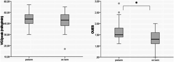 What is new: • Children born prematurely were comparable to an age- and sex-matched control group with regards to almost all cardiopulmonary exercise variables. • A significantly higher OUES, a surrogate parameter for VO2peak was found for the group of former preterm children, most likely reflecting on more physical exercise in this group. Importantly, there were no signs of impaired cardiopulmonary function in the group of former preterm children.
