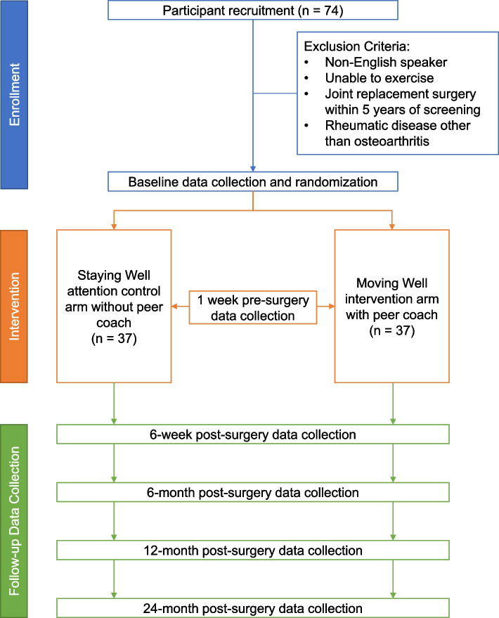 Methods: This is an open-label pilot randomized clinical trial that will test the feasibility and effectiveness of the Moving Well intervention compared to an attention control group, Staying Well, to reduce symptoms of anxiety and depression in patients with KOA undergoing TKR. The Moving Well intervention is guided by Social Cognitive Theory. During this 12-week intervention, participants will receive 7 weekly calls before surgery and 5 weekly calls after surgery from a peer coach. During these calls, participants will be coached to use principles of cognitive behavioral therapy (CBT), stress reduction techniques, and will be assigned an online exercise program, and self-monitoring activities to complete on their own time throughout the program. Staying Well participants will receive weekly calls of similar duration from research staff to discuss a variety of health topics unrelated to TKR, CBT, or exercise. The primary outcome is the difference in levels of anxiety and/or depression between participants in the Moving Well and Staying Well groups 6 months after TKR.