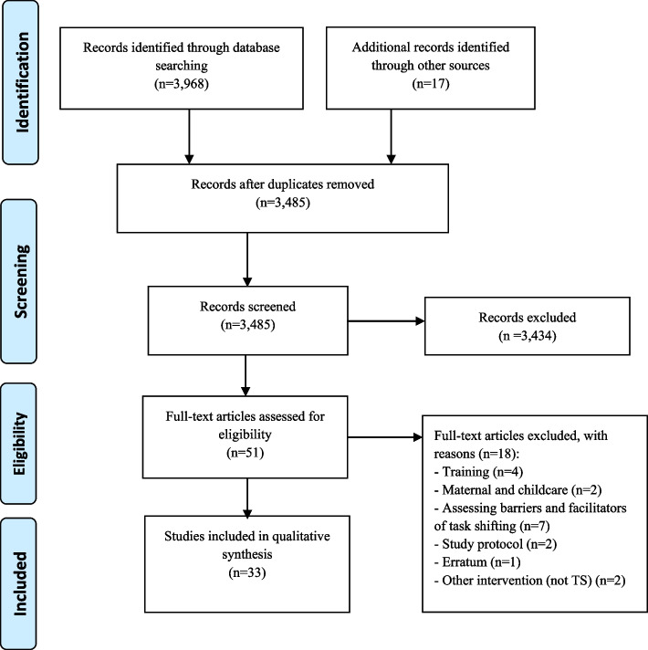 Results: Thirty-three studies, conducted in 10 African countries (South Africa, Nigeria, Ghana, Kenya, Cameroon, Democratic Republic of Congo, Ethiopia, Malawi, Rwanda, and Uganda) were eligible for inclusion. There were few randomized controlled trials (n = 6; 18.2%), and tasks were mostly shifted for hypertension (n = 27; 81.8%) than for diabetes (n = 16; 48.5%). More tasks were shifted to nurses (n = 19; 57.6%) than pharmacists (n = 6; 18.2%) or community health workers (n = 5; 15.2%). Across all studies, the most common role played by HRH in task shifting was for treatment and adherence (n = 28; 84.9%) followed by screening and detection (n = 24; 72.7%), education and counselling (n = 24; 72.7%), and triage (n = 13; 39.4%). Improved blood pressure levels were reported in 78.6%, 66.7%, and 80.0% for hypertension-related task shifting roles to nurses, pharmacists, and CHWs, respectively. Improved glycaemic indices were reported as 66.7%, 50.0%, and 66.7% for diabetes-related task shifting roles to nurses, pharmacists, and CHWs, respectively.