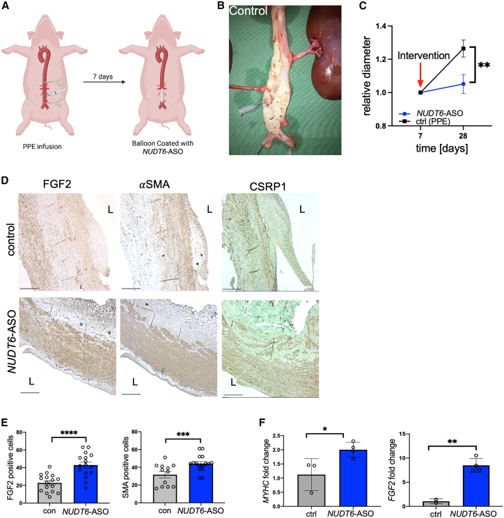 Long non-coding RNAs (lncRNAs) orchestrate various biological processes and regulate the development of cardiovascular diseases. Their potential therapeutic benefit to tackle disease progression has recently been extensively explored. Our study investigates the role of lncRNA Nudix Hydrolase 6 (NUDT6) and its antisense target fibroblast growth factor 2 (FGF2) in two vascular pathologies: abdominal aortic aneurysms (AAA) and carotid artery disease. Using tissue samples from both diseases, we detected a substantial increase of NUDT6, whereas FGF2 was downregulated. Targeting Nudt6 in vivo with antisense oligonucleotides in three murine and one porcine animal model of carotid artery disease and AAA limited disease progression. Restoration of FGF2 upon Nudt6 knockdown improved vessel wall morphology and fibrous cap stability. Overexpression of NUDT6 in vitro impaired smooth muscle cell (SMC) migration, while limiting their proliferation and augmenting apoptosis. By employing RNA pulldown followed by mass spectrometry as well as RNA immunoprecipitation, we identified Cysteine and Glycine Rich Protein 1 (CSRP1) as another direct NUDT6 interaction partner, regulating cell motility and SMC differentiation. Overall, the present study identifies NUDT6 as a well-conserved antisense transcript of FGF2. NUDT6 silencing triggers SMC survival and migration and could serve as a novel RNA-based therapeutic strategy in vascular diseases.