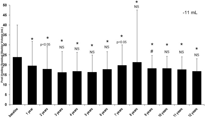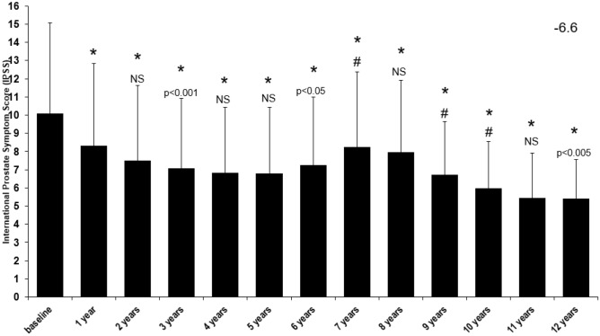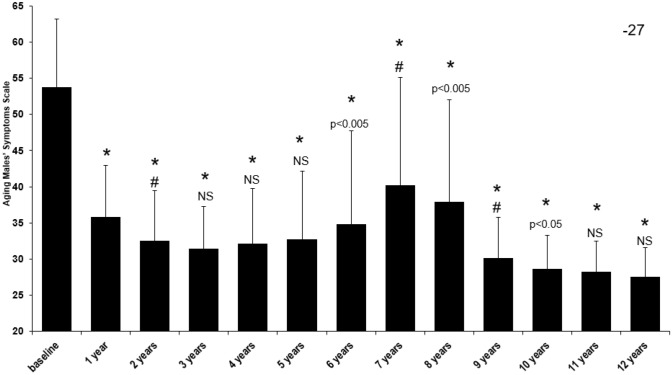 Patients and methods: In this study 321 hypogonadal patients with an average age of 58.9 ± 9.52 years received testosterone undecanoate in 12-week intervals for 12 years. One hundred and forty-seven of these males had the testosterone treatment interrupted for a mean of 16.9 months before it was resumed. Total testosterone, International Prostate Symptom Scale (IPSS), post-voiding residual bladder volume and aging male symptoms (AMS) were measured over the study period.