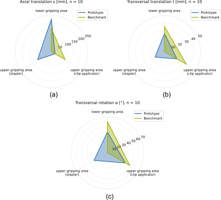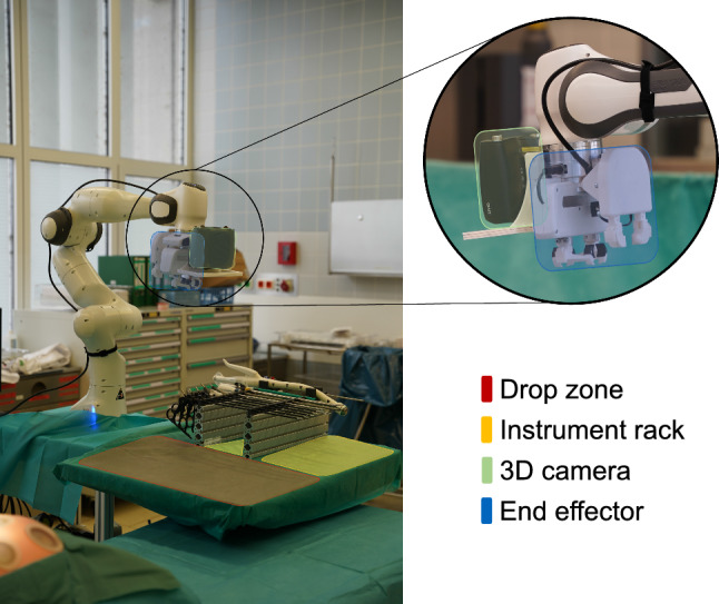 Results: The test protocol shows results regarding force and torque absorption capabilities of the end effector, which are essential when transferring an instrument to the surgeon to enable a robust handover. The grip tests show that the laparoscopic instruments can be safely picked up, manipulated and returned independent of unexpected positional deviations. The gripper system also enables the manipulation of da Vinci[Formula: see text] instruments, opening the door for robot-robot interaction.